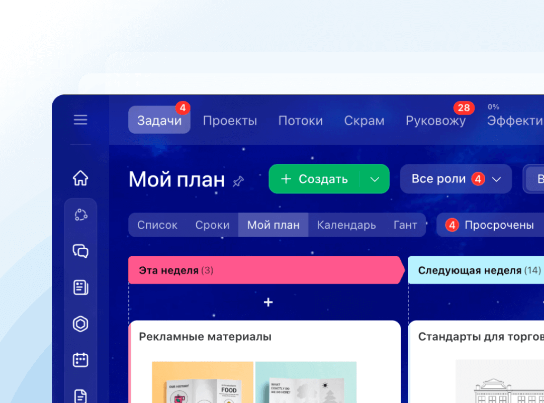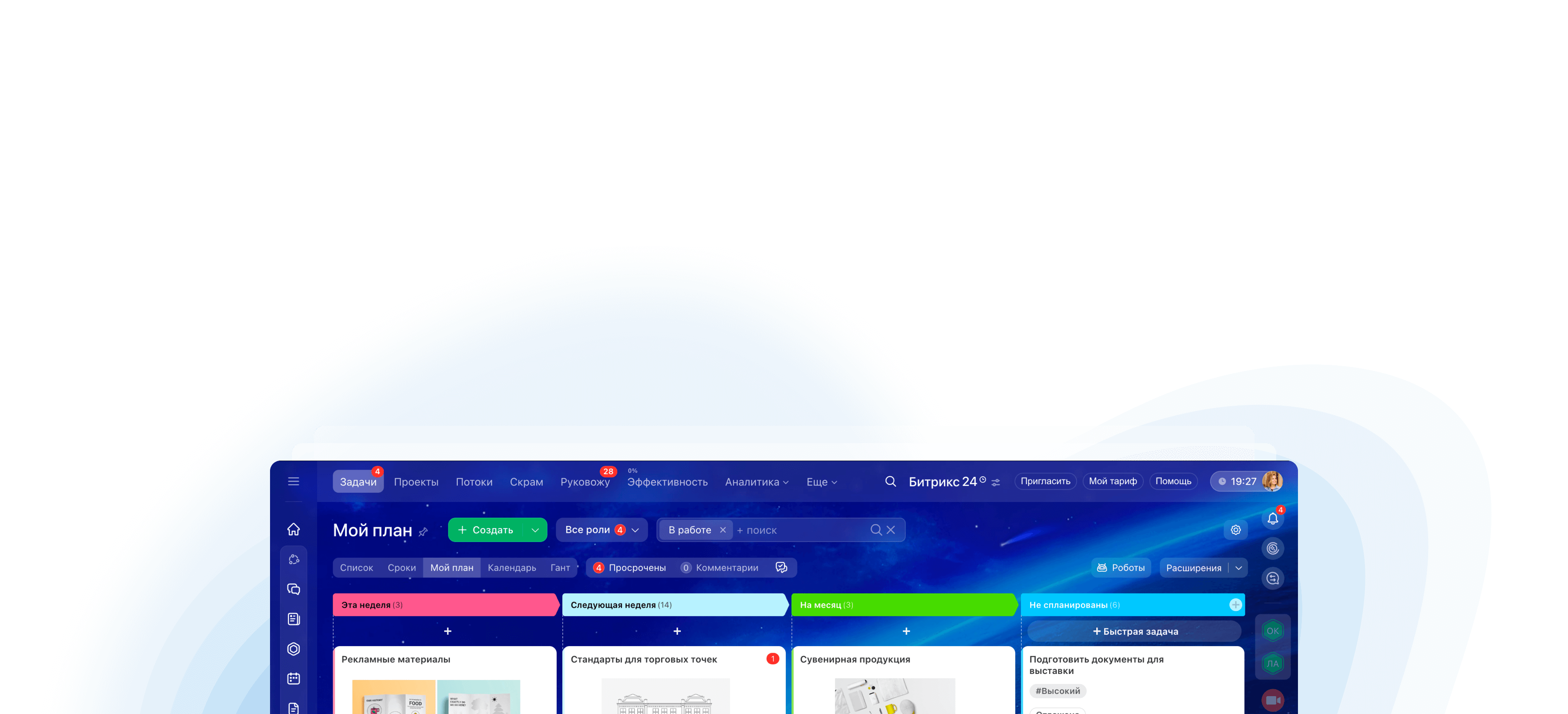 Битрикс24 организует эффективную работу над задачами и проектами. Позволяет использовать разные методики: Мой план, Канбан, диаграмму Ганта, Скрам. Задача, поставленная в Битрикс24, — это выполненная задача!