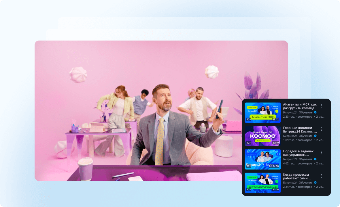 Сразу после регистрации вы получите доступ к материалам по Битрикс24: видеоролики, вебинары, полезные статьи, а также нашу постоянную поддержку по телефону и электронной почте.