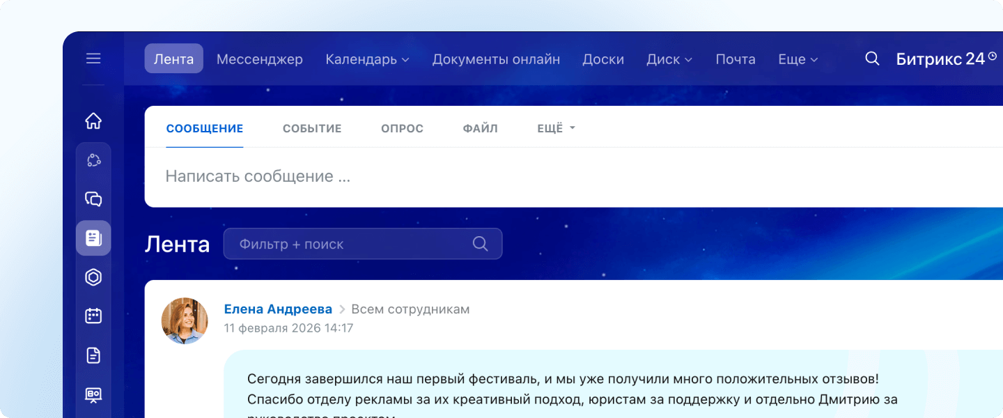 Битрикс24 заменяет сразу десятки инструментов для совместной работы, продаж и автоматизации бизнеса.