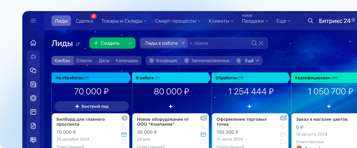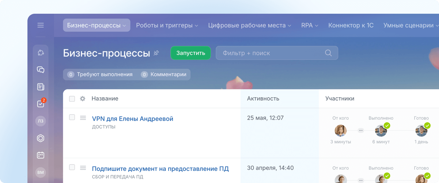 Битрикс24 автоматизирует всё, что мешает двигаться вперед — рутинные задачи, работу со сделками, согласование договоров, оплату счетов, отчетность. Есть инструменты и для простых триггерных рассылок, и для полной автоматизации рабочего места. И всё это запускается без программирования.