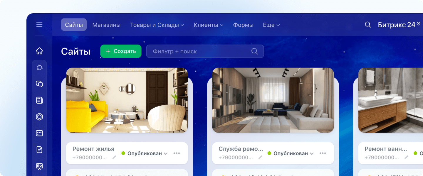 Легкое создание сайтов в простом и удобном конструкторе. Онлайн-чат, обратный звонок, форма обратной связи для сбора заявок и онлайн-продаж. Все контакты клиентов с сайта сразу заносятся в CRM.